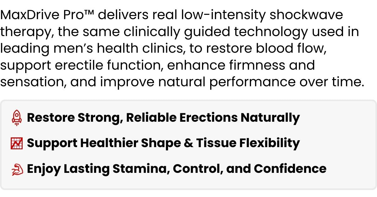 “Devices like MaxDrive Pro™, which combine low-intensity shockwave therapy with targeted vibration, help improve blood flow, enhance tissue elasticity, support nerve responsiveness, and promote healthy prostate function. With consistent use, they offer a safe, drug-free approach to improving erectile performance and maintaining long-term prostate wellness—grounded in established clinical principles of men’s health.”